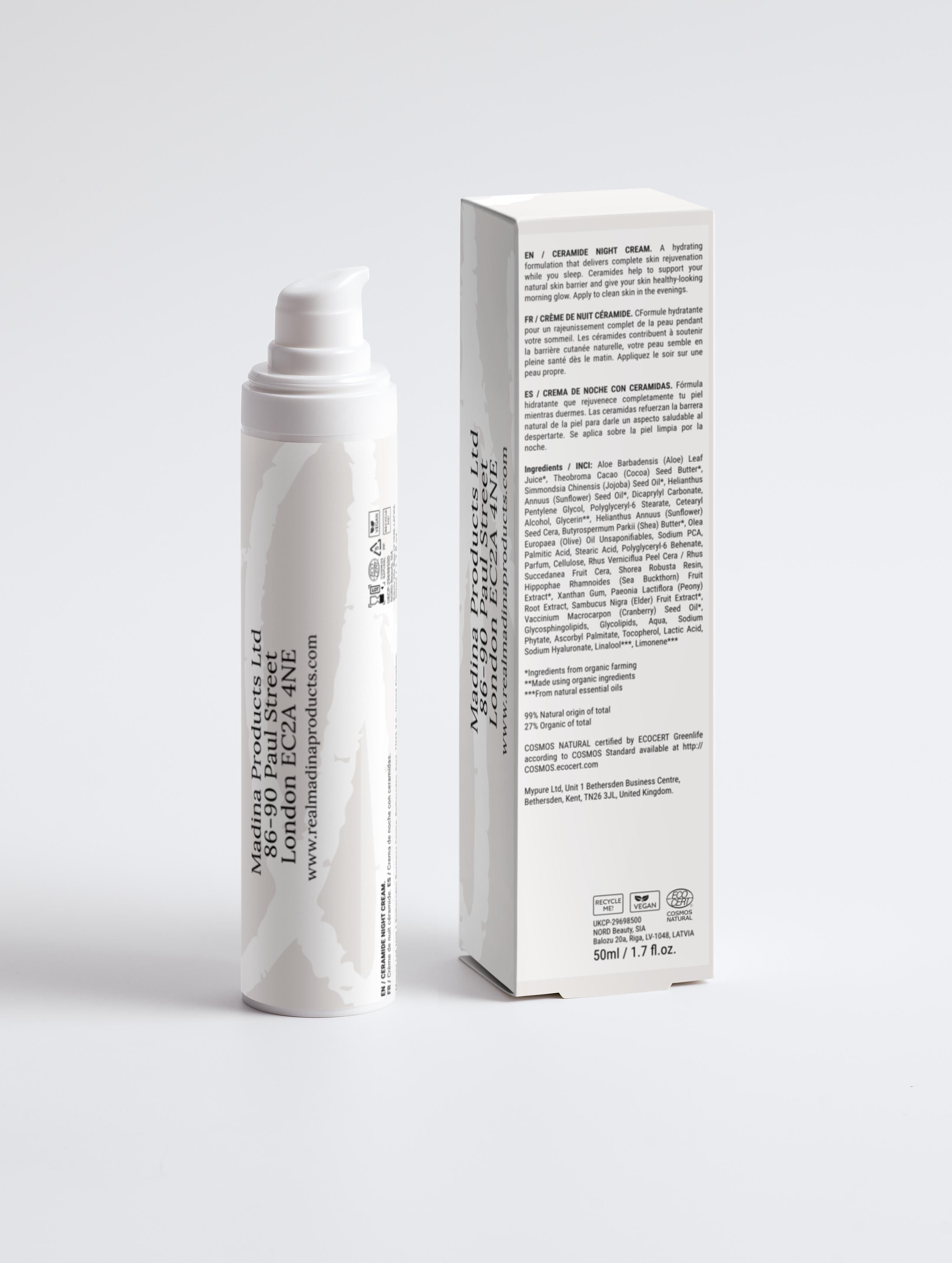Product description: The Ceramide Hydrating Night Cream is thoughtfully formulated with ingredients that work their magic overnight, promoting skin renewal and a radiant glow. Hydrating formulation glides effortlessly onto your skin and delivers complete skin rejuvenation while you sleep. Ceramides help to support natural skin barrier and give your skin healthy-looking skin in the morning. Apply to clean skin in the evenings. Combine with: Botox-Like Peptide Serum or Nourishing Facial Oil and Smoothing Eye Cream for a complete night time routine. In addition, use the Moisturising Day Cream during your morning skincare routine. Deeply moisturizing, Supports skin barrier, face-care, Moisturiser (Type), Anti-age (Concern), Dehydrated skin (Concern), Damaged skin barrier (Concern), Normal (Skin type), Dry (Skin type), All skin types (Skin type), Ceramides (Active ingredients), Hyaluronic Acid (Active ingredients), Shea Butter (Active ingredients), Aloe Juice (Active ingredients), White (Packaging color) Ceramides, Aloe Juice, Jojoba Oil, Sunflower Oil, Cocoa Butter, Shea Butter, Sodium PCA, Hyaluronic Acid Ingredients / INCI: Aloe Barbadensis (Aloe) Leaf Juice➀, Theobroma Cacao (Cocoa) Seed Butter➀, Simmondsia Chinensis (Jojoba) Seed Oil➀, Helianthus Annuus (Sunflower) Seed Oil➀, Dicaprylyl Carbonate, Pentylene Glycol, Polyglyceryl-6 Stearate, Cetearyl Alcohol, Glycerin➁, Helianthus Annuus (Sunflower) Seed Cera, Butyrospermum Parkii (Shea) Butter➀, Olea Europaea (Olive) Oil Unsaponifiables, Sodium PCA, Palmitic Acid, Stearic Acid, Polyglyceryl-6 Behenate, Parfum, Cellulose, Rhus Verniciflua Peel Cera / Rhus Succedanea Fruit Cera, Shorea Robusta Resin, Hippophae Rhamnoides (Sea Buckthorn) Fruit Extract➀, Xanthan Gum, Paeonia Lactiflora (Peony) Root Extract, Sambucus Nigra (Elder) Fruit Extract➀, Vaccinium Macrocarpon (Cranberry) Seed Oil➀, Glycosphingolipids, Glycolipids, Aqua, Sodium Phytate, Ascorbyl Palmitate, Tocopherol, Lactic Acid, Sodium Hyaluronate, Linalool➂, Limonene➂   ➀ Ingredients from organic farming ➁ Made using organic ingredients ➂ From natural essential oils