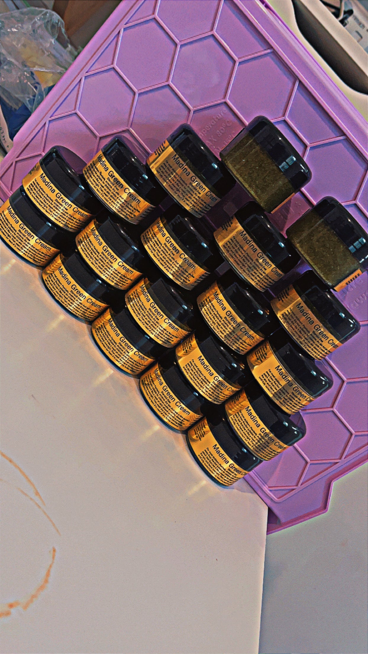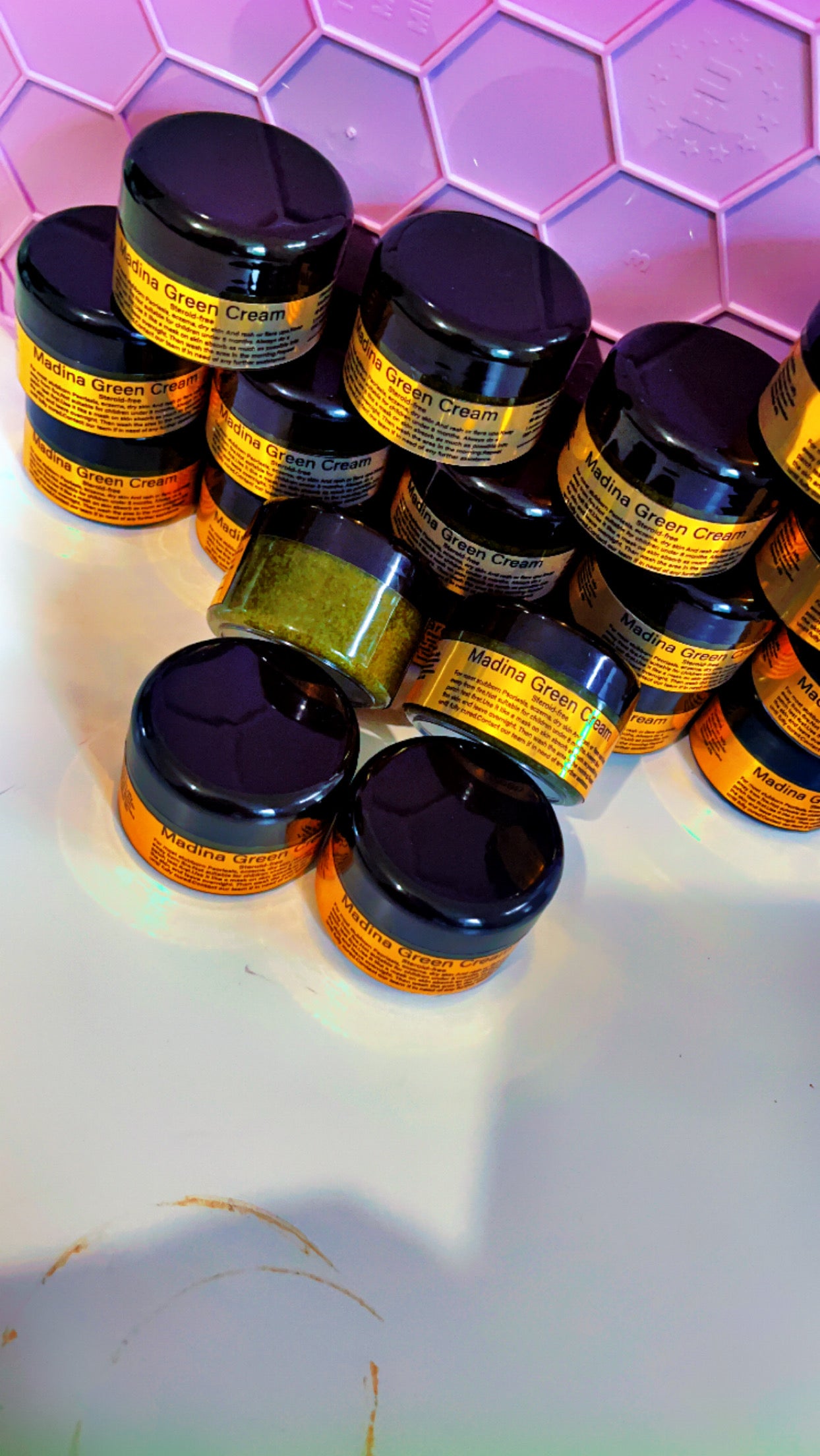 "The famous Madina's Orange Cream, a potent blend of petroleum jelly, pure saffron, and curcumin that tackles various skin concerns. This cream is designed to provide relief from psoriasis, eczema, acne, pigmentation, rashes, and dry skin, while also reducing the appearance of eye bags, spots, marks, and dark circles. It’s completely steroid free and with its nourishing properties, Madina's Orange Cream helps to achieve a radiant glow and even out skin tone, leaving your skin looking smoother, brighter, and more even-toned."